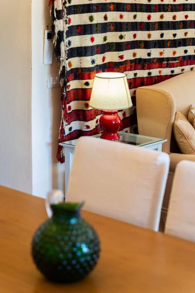 In the living area, There is a beautifully “intarsiato” olive tree table with 8 chairs.