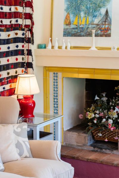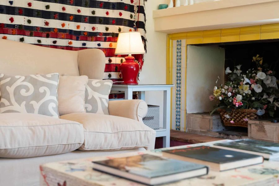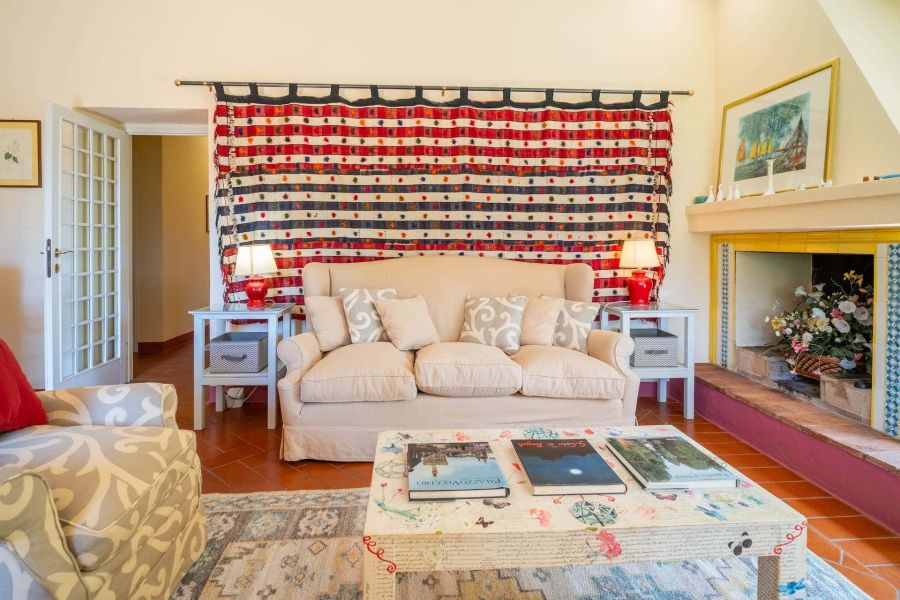 To the right a comfortable sofa with 2 armchairs and an ottoman nestle around the fireplace framed in tiles from Vietri.