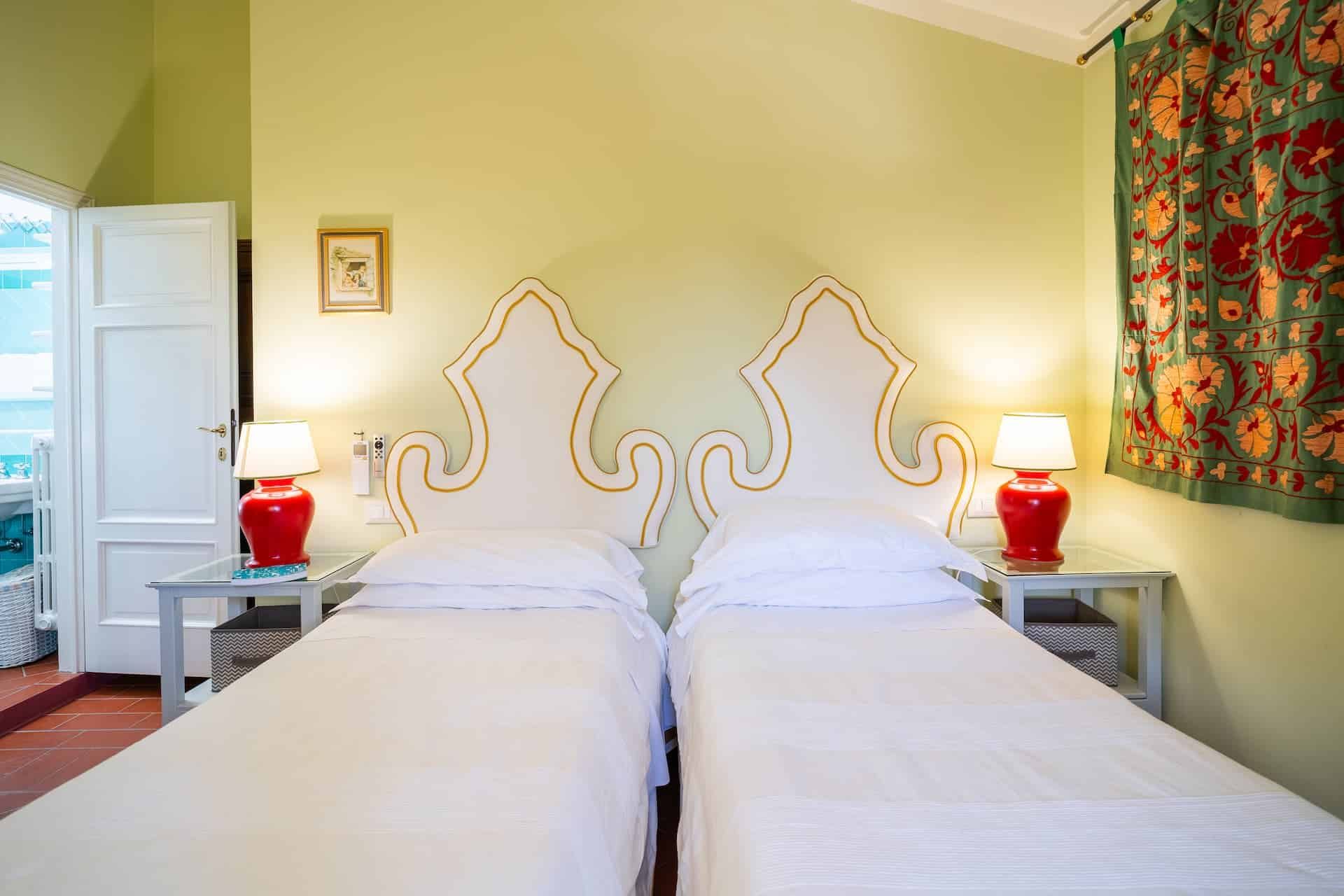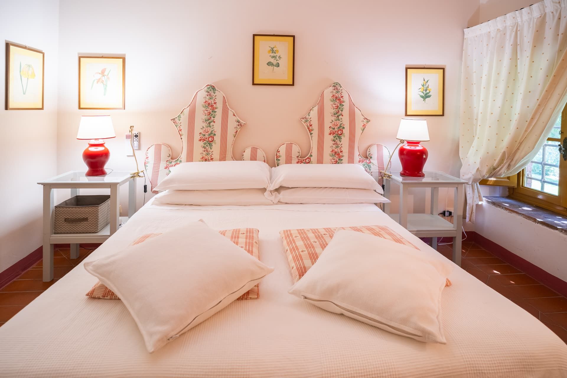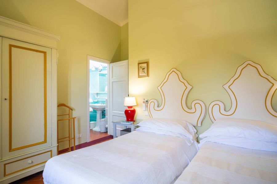 Double Bedroom: Two single joinable beds with antique Florentine upholstered headboards welcome the guest to this nice room with in-suite bathroom. A beautiful wardrobe and matching chest of drawers offer our guests all the necessary room for their clothes. The two beds can very easily be made into a double bed.