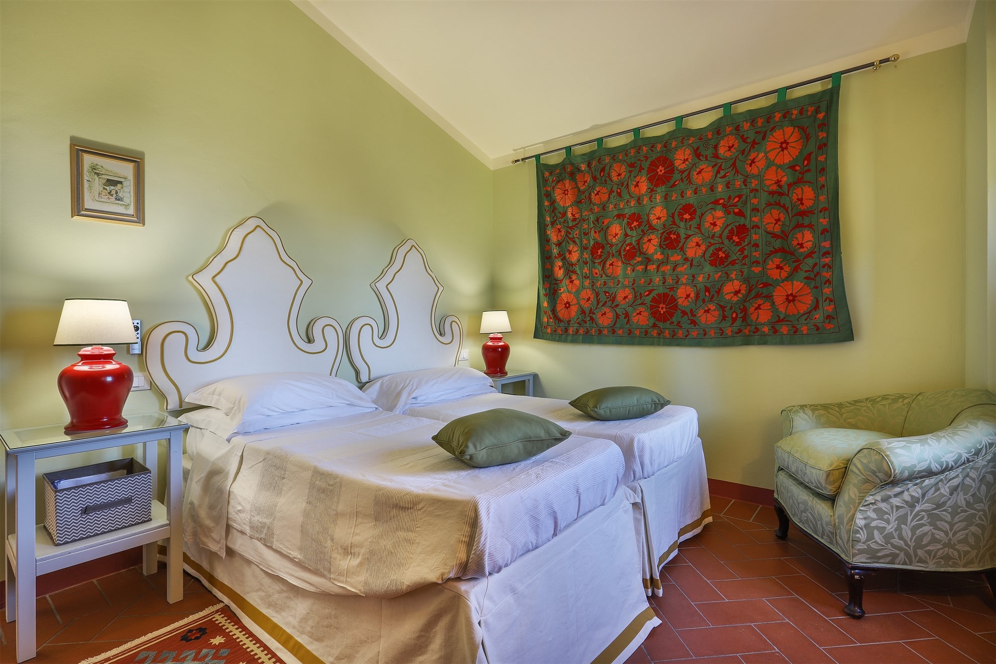 Double Bedroom: Two single joinable beds with antique Florentine upholstered headboards welcome the guest to this nice room with in-suite bathroom. A beautiful wardrobe and matching chest of drawers offer our guests all the necessary room for their clothes. The two beds can very easily be made into a double bed.